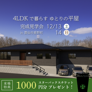 雲仙市愛野町にて、お施主様のご厚意により注文住宅の完成見学会を開催いたします。
