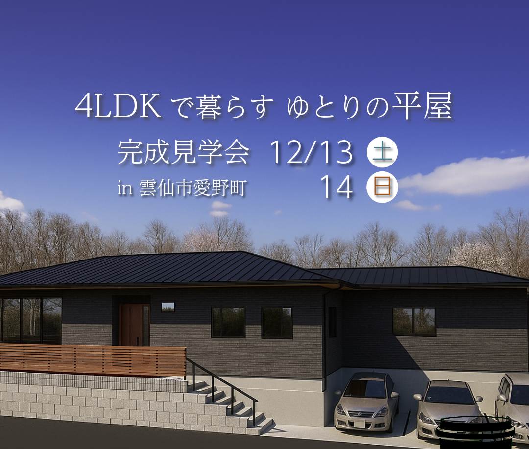 4LDKで暮らすゆとりの平屋 完成見学会 2025.11.15 NEW! イベント情報 雲仙市愛野町にて、お施主様のご厚意により注文住宅の完成見学会を開催いたします。写真では伝わらない雰囲 …続きを読む