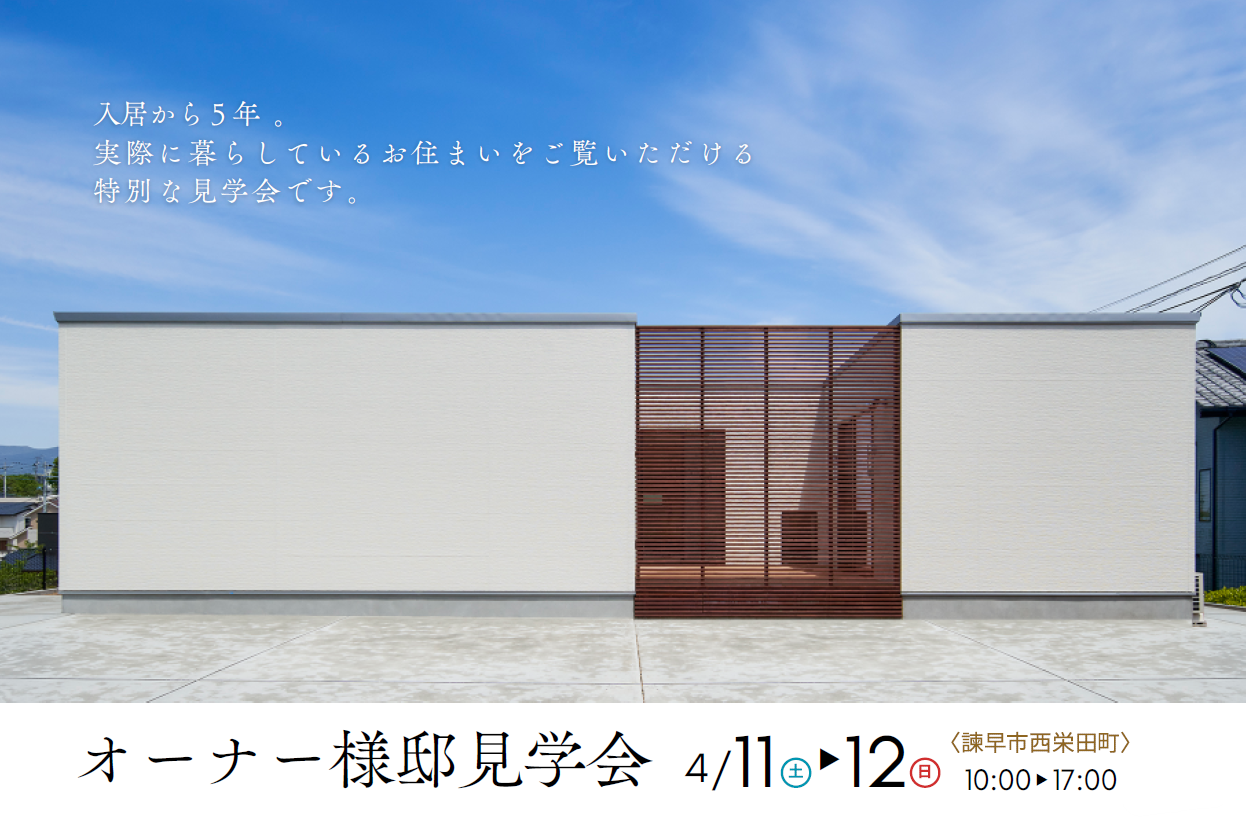 中庭を囲む平屋オーナー様邸見学会 2026.02.23 実際に生活しているオーナー様邸を見学できる特別な2日間 日時 4月11日(土)、12日(日) …続きを読む “ウチ”と“ソト”が緩やかにつながる、開放感あふれる家 2026.02.02 日時 3月7日(土)、8日(日) 10時~17時 場所 長崎市高浜町(Googlemap …続きを読む トップページに戻る